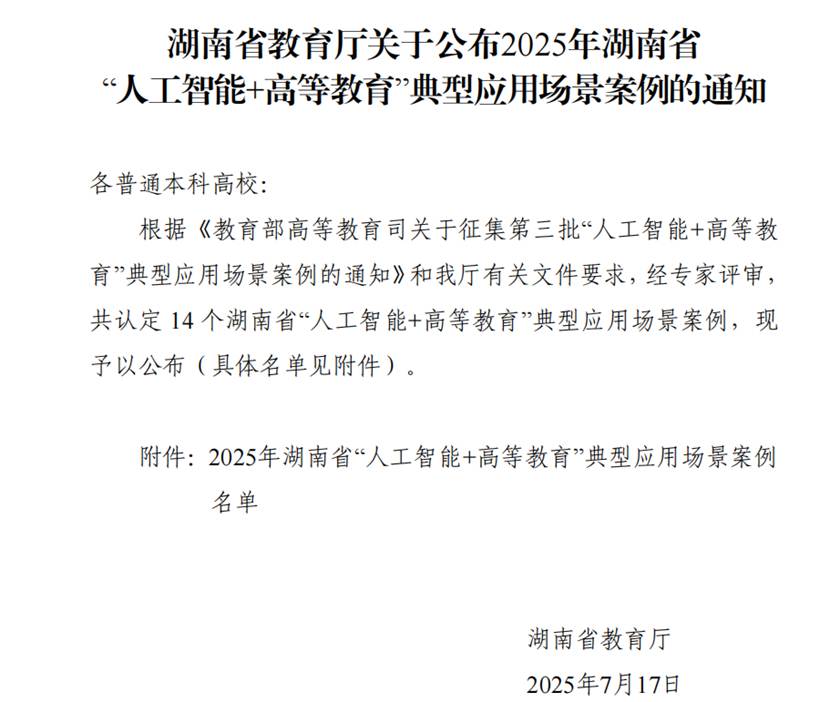 近日,湖南省教育厅下发了《湖南省教育厅关于公布2025年湖南省“人工智能+高等教育”典型应用场景案例的通知》,我校教务处处长李理教授团队撰写的“AI赋能工程教育课程体系建设与教学实践——云享湖工AI教育科创中心的应用”被认定为湖南省“人工智能+高等教育典型应用场景案例”,今年湖南省共认定14个典型案例。这个案例是我校被湖南省认定的首个典型案例,同时被湖南省推荐参评教育部典型案例。
